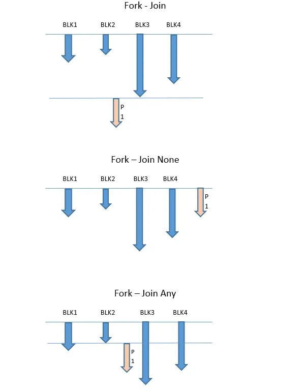 If we replace line 26 with joinnone, without waiting for any of the blocks completion, parent process will start. Other process will be left running and we will get the same order as in fork-join.