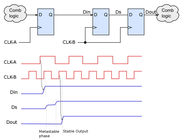 When an asynchronous signal, or a signal from a block clocked by a different clock is received by a synchronous circuit, it is imperative that it is reliably sampled by the receiver. Since the signal is asynchronous to the receiver in these cases, a special circuitry named synchronizer is used to ensure proper sampling and synchornization with respect to the receiving clock. If the data changes in an unacceptable range of the clock, metastability occurs as explained previously. This can be avoided by giving enough time for the meta stable output to settle down. The most common method used is the two stage synchronizer using flops.